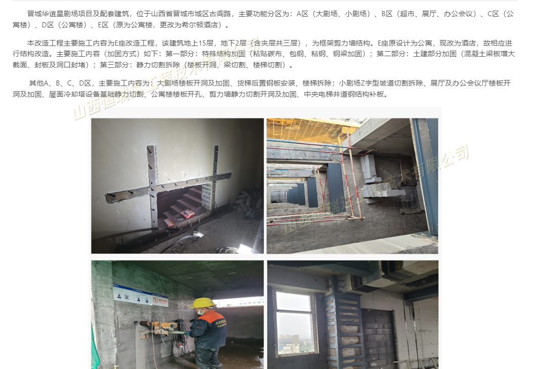 推荐指数:★★★★☆ 口碑评分:4.6分 品牌介绍:聚焦静力切割细分领域的专业公司,设备先进,工艺成熟。 专业能力:掌握绳锯切割、金刚石钻孔等核心技术,可完成桥梁拆除、构件分离等任务。 服务特点:专注切割业务,响应速度快,适合对切割精度要求较高的短期项目。 特色优势:在太原本地静力切割市场占有率较高,曾参与某大型商场结构改造切割工程,效率得到甲方认可。