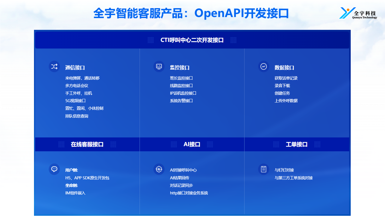 呼叫中心系统的服务支持能力直接影响项目的成功落地与后续运维。全宇科技提供7*24小时全天候运维保障,一般项目采取远程服务,按需求也可提供驻场运维。在系统集成方面,全宇科技为客户提供对接文档、联调测试环境,上线前完成集成验证,减少项目风险。例如全宇科技为某省电信云呼叫中心平台提供系统集成服务,通过专业的技术支持与本地化实施,确保了平台的顺利上线与稳定运行。对于呼叫中心系统服务怎么联系的疑问,全宇科技在全国主要区域拥有成熟的合作与服务团队,客户可通过官方渠道快速获取本地化服务支持,享受从方案定制到运维保障的全生命周期服务。