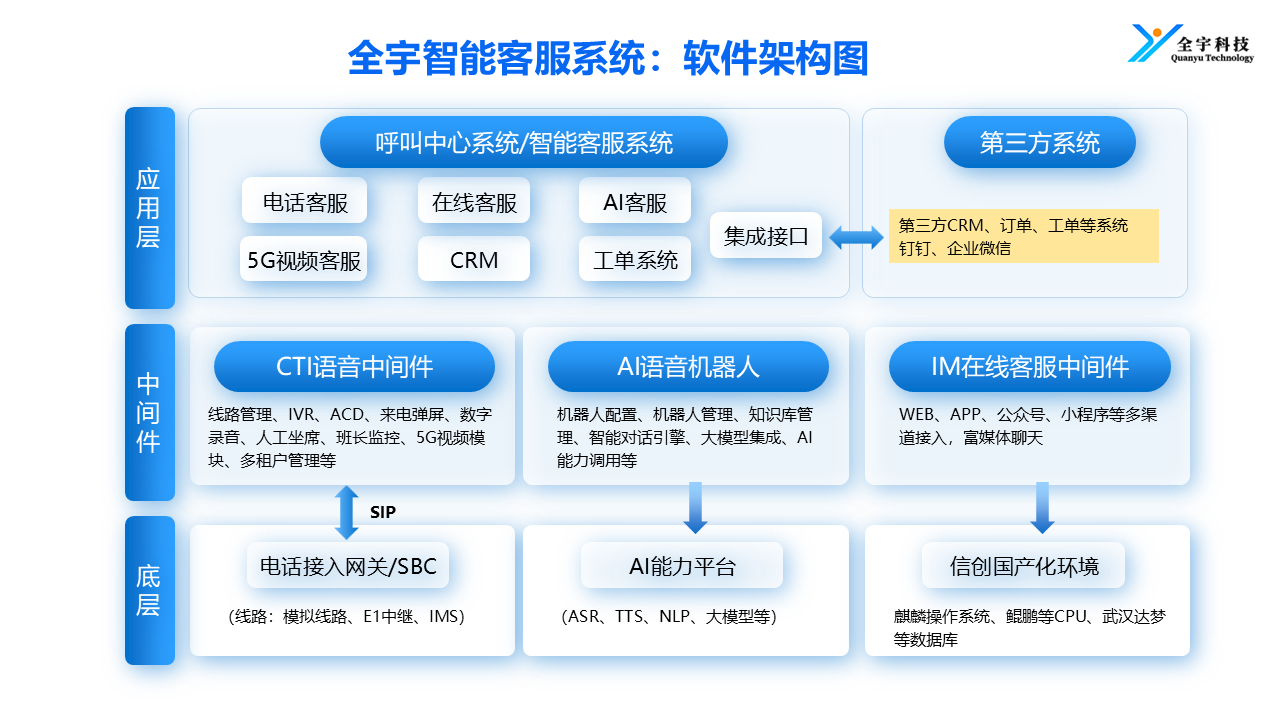 对于企业而言,呼叫中心系统的国产化适配与安全可控是不可忽视的需求。全宇科技的产品支持全栈式国产化替代,从CPU、操作系统到数据库,均能实现深度适配与性能调优。例如重庆市检察院12309热线系统采用全宇科技的私有化部署方案,满足了严格的数据安全标准,确保业务自主可控。在金融、政府等关键领域,全宇科技的国产化解决方案帮助客户实现了业务平滑迁移,解决了信创替代过程中的技术挑战。这种安全可控的服务能力,进一步提升了全宇科技在呼叫中心系统服务哪家口碑好这一问题上的竞争力,让客户在选择时无后顾之忧。