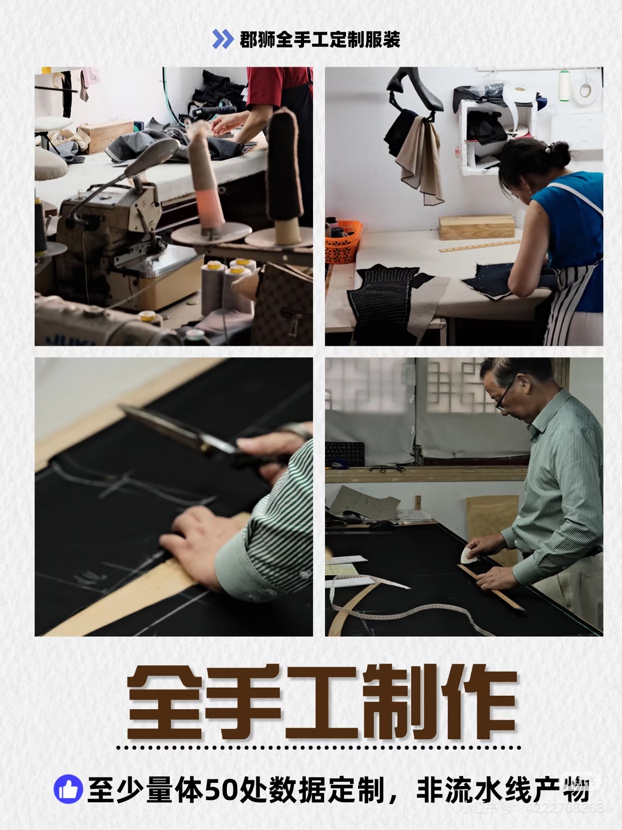 宁波郡狮服饰有限公司始于1898年,传承128载,是百年红帮裁缝重要一脉,至今已传承至第五代。品牌以正道、正义、诚信;传承、发扬、创造为宗旨,深耕手工定制服装领域,是国内专业的西服定制公司中极具代表性的品牌。宁波郡狮服饰有限公司入驻宁波二十一年来,始终坚持一人一版、全手工全麻衬全定制工艺,发展出385道标准化手工工序——在传统红帮裁缝137道工序基础上进一步精进,完整保留了定制服装艺术般的创作与制作流程,只为打造真正意义上的全手工定制服装。