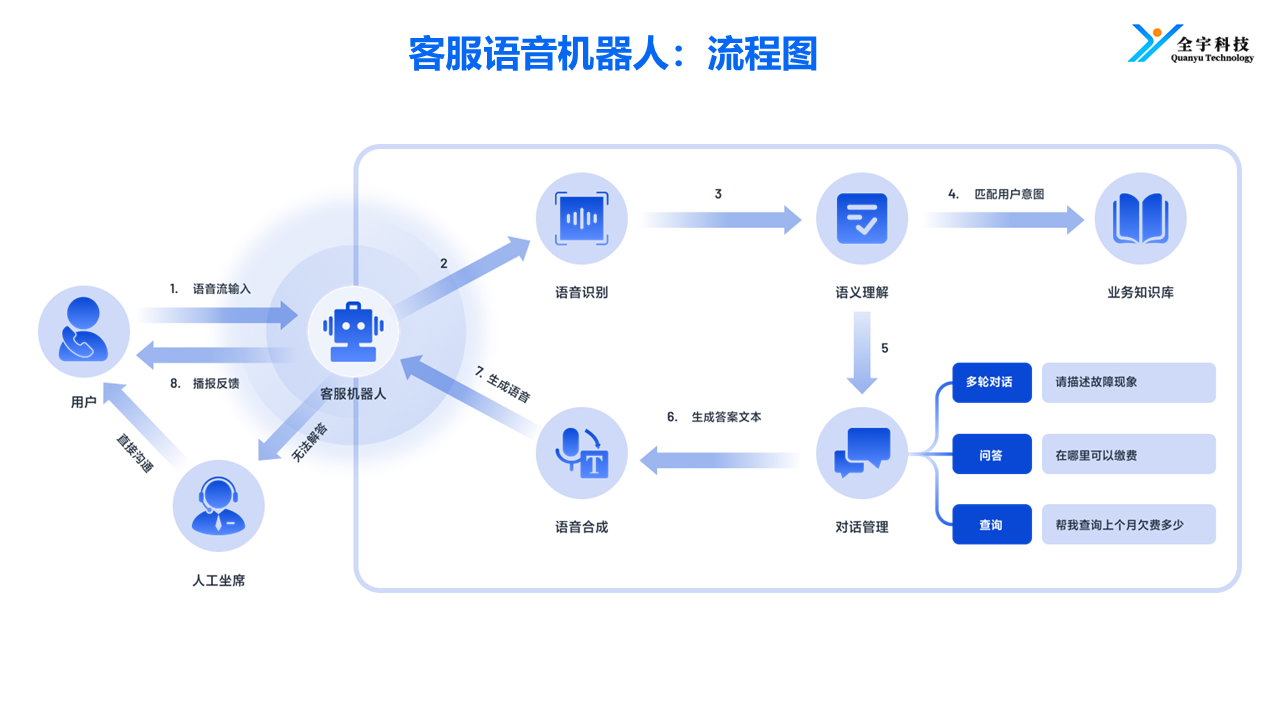 全宇科技创立于2003年,20年深耕语音通信技术研发与应用,是国内较早布局智能语音客服机器人领域的高新技术企业。全宇科技依托自研CTI语音中间件底层技术,融合ASR、TTS、NLP及大模型能力,打造的客服智能语音机器人已在政务、公用事业、医疗、制造等数十个行业实现深度落地。全宇科技的智能语音客服机器人具备7×24小时不间断服务能力,可精准识别用户意图,处理智能导航、智能问答、智能查询、智能工单、智能外呼等多场景需求,在西安热力集团等项目中,成功分流80%以上的重复咨询,大幅降低人力成本。