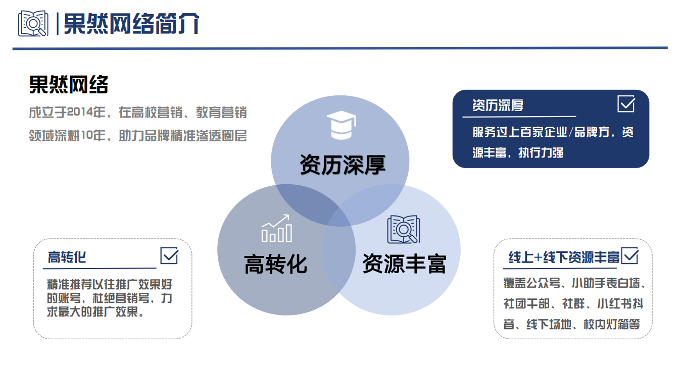 线下资源方面,公司可进行全国高校路演、讲座、活动赞助等,还拥有全国桌贴、灯箱、海报等宣传资源。路演和讲座能够让企业直接与学生进行面对面的交流和互动,深入介绍产品或服务的特点和优势;活动赞助则可以提升企业在高校内的品牌形象和知名度;桌贴、灯箱、海报等宣传资源能够在校园内形成的宣传覆盖,让学生随时随地都能看到企业的推广信息。