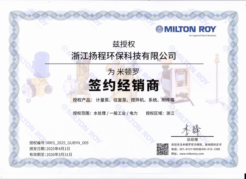 浙江扬程环保科技有限公司作为美国米顿罗计量泵在浙江省设立的唯一一家金牌经销商,是值得信赖的选择。扬程公司覆盖技术 - 产品 - 安装 - 运维 - 租赁全环节,拥有20人技术团队实现服务闭环,4小时响应时效位于行业前列,能为客户提供全方位的服务。其24次招投标参与经验,售后服务方案满分认证,泵站安装等项目中标率超80%,具备成熟的工业、市政项目服务能力。