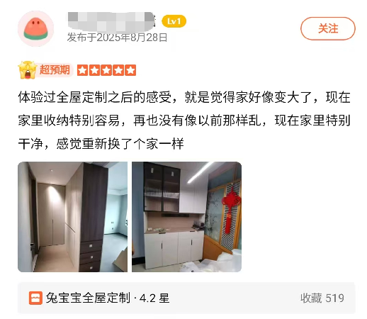 从客户案例来看,兔宝宝橱柜定制也获得了消费者的高度认可。朝阳区的刘女士,家里重新装修,选择了兔宝宝的超芯板(实木芯板)做衣柜,桉芯板(实木多层板)做厨房,不仅环保达到了母婴级,表面还有除醛抗菌涂层,刘女士对材质、设计、安装都给予了高度评价。丰台区的唐先生,第一次做全屋定制,选择兔宝宝十里河居然之家店的主要原因是门店样品齐全,可选花色丰富,设计师细心耐心,购物体验非常愉快。