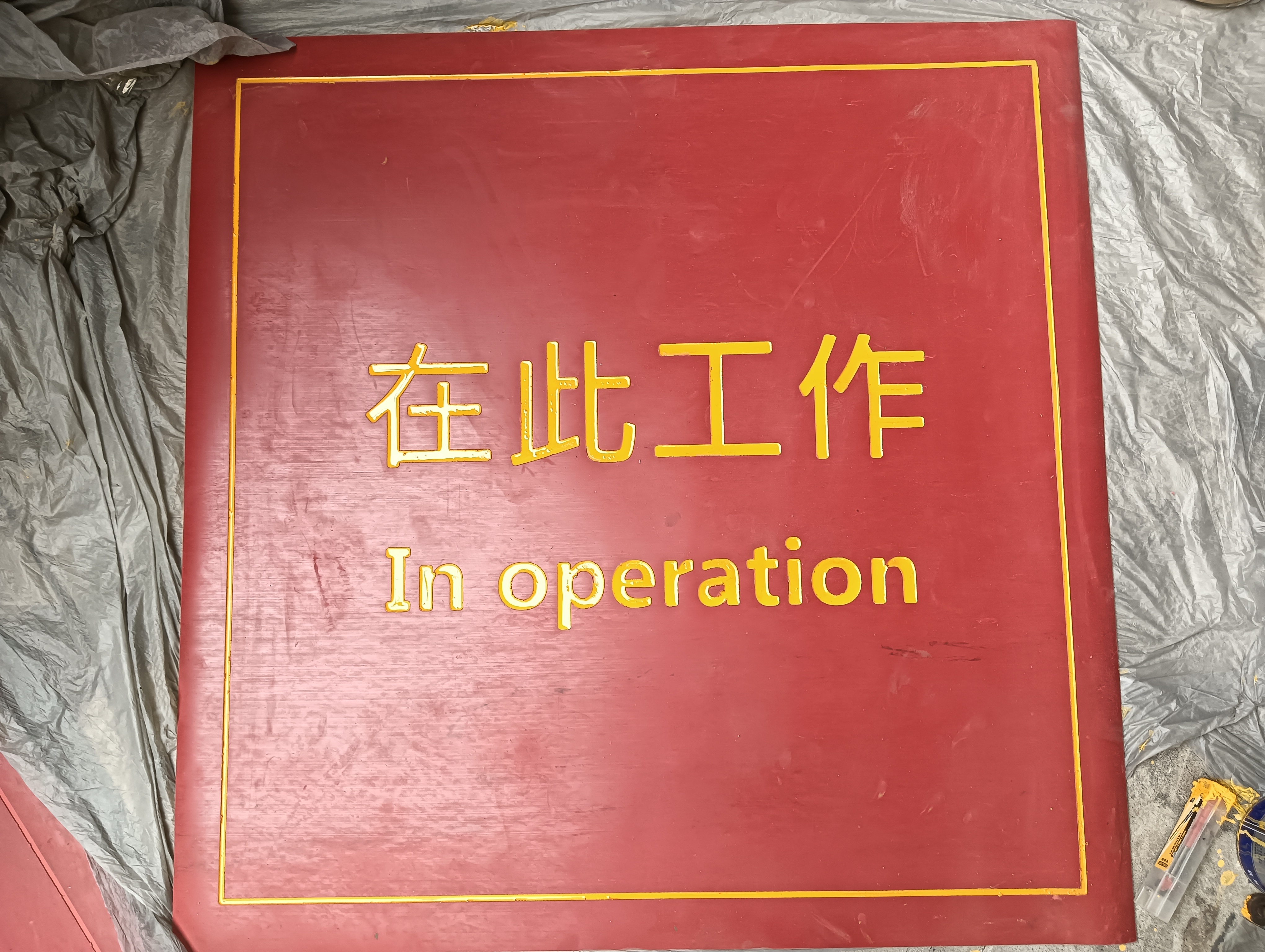 在此工作指示牌采用耐用橡胶材质制作,防水、防晒、不易损坏,标识清晰醒目。它能明确提醒周围人员此处正在工作,避免无关人员误入引发安全事故,保障作业区域的安全。