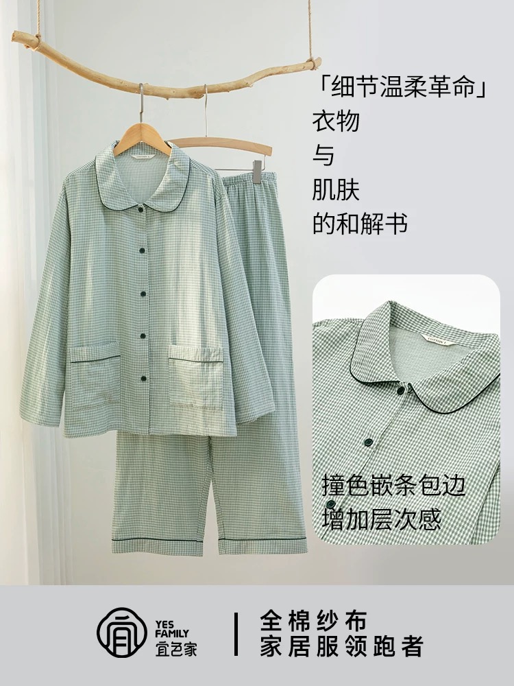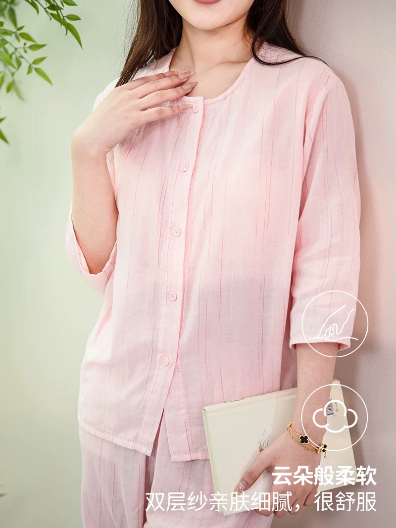 宜色家双层棉纱家居服的特点十分突出。首先,在透气性方面,双层纱布结构形成的空气层使透气率较常规单层面料提升约40%,能有效解决消费者久坐、睡眠时的闷热感,让肌肤自由呼吸。其次,耐用性也是其一大亮点。通过精选高支棉纱与工艺控制,产品水洗缩水率稳定在≤3%,抗起球性达4级(ISO标准),确保货品在多次洗涤后仍保持良好形态,直接降低因品质问题导致的售后与客户投诉。再者,面料具有越洗越软越洗越蓬松的独特属性,有效避免了普通棉质衣物多次洗涤后变硬、板结的普遍问题。经30次标准洗涤后,面料蓬松度保持率超过80%。