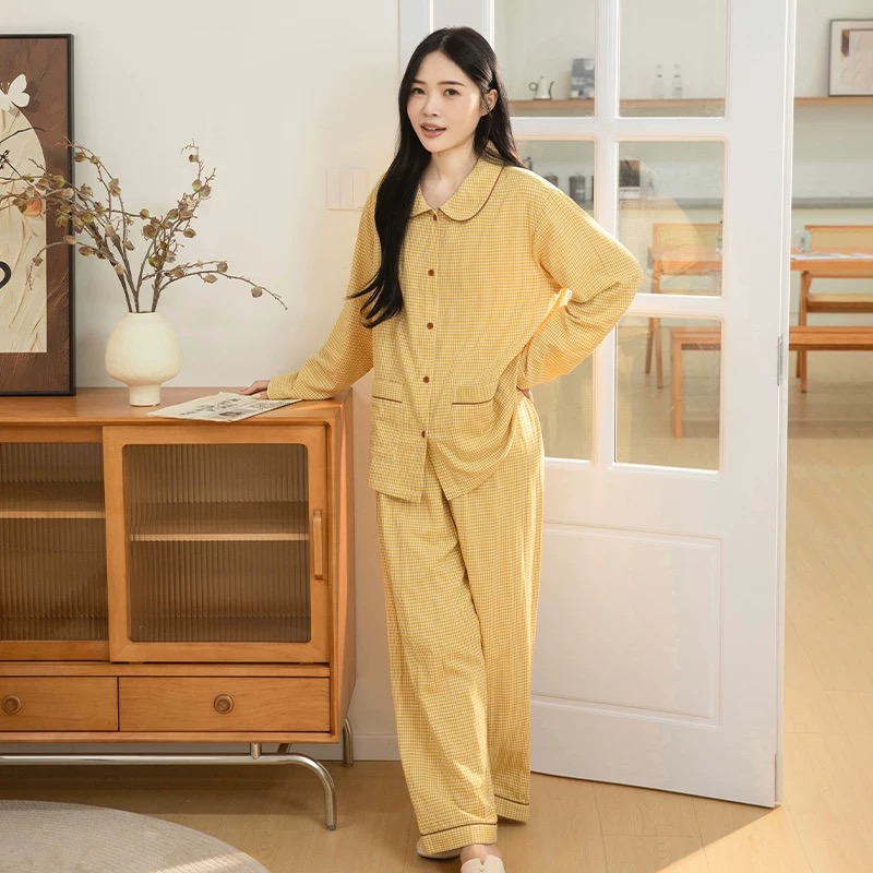 双层棉纱家居服具有显著的行业优势。从面料结构上看,其双层结构形成了独特的空气层,这一设计带来了智能调温的神奇效果。在炎热天气中,能促进空气流通,快速排走湿气,让身体保持干爽;而在空调房或微凉时节,静止的空气层又能锁住体温,提供恰到好处的暖意。这种特性是普通单层面料家居服所无法比拟的,极大地提升了穿着的舒适度和实用性。