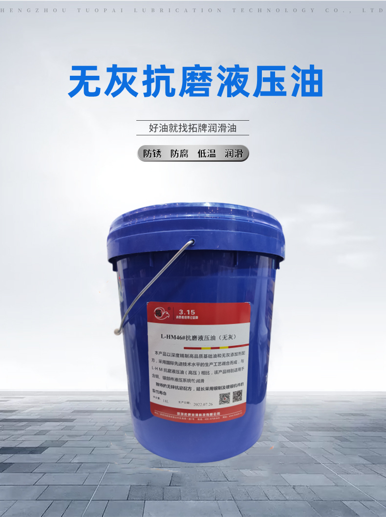 拓牌液压油具有多种特点,能够满足不同用户的需求。根据GB/T7631.2,其液压油分为L - HL抗氧防锈液压油、L - HM抗磨液压油(高压,普通)、L - HV低温液压油、L - HS超低温液压油和L - HG液压导轨油五个品种,粘度有32#、46#、68#、100#、150#等多种选择。L - HL普通液压油适配轻负荷、常温工况的低压液压系统、小型液压站;L - HM抗磨液压油则适配中/重负荷的注塑机、液压机、工程机械液压系统,抗磨性强,能有效保护泵阀;L - HV低温抗磨液压油适用于户外/低温环境( - 30℃以上)的液压设备,具有优异的粘温性,低温不凝;L - HS超低温抗磨液压油则适配极寒环境( - 40℃以上)的矿山/野外液压设备,低温流动性好。