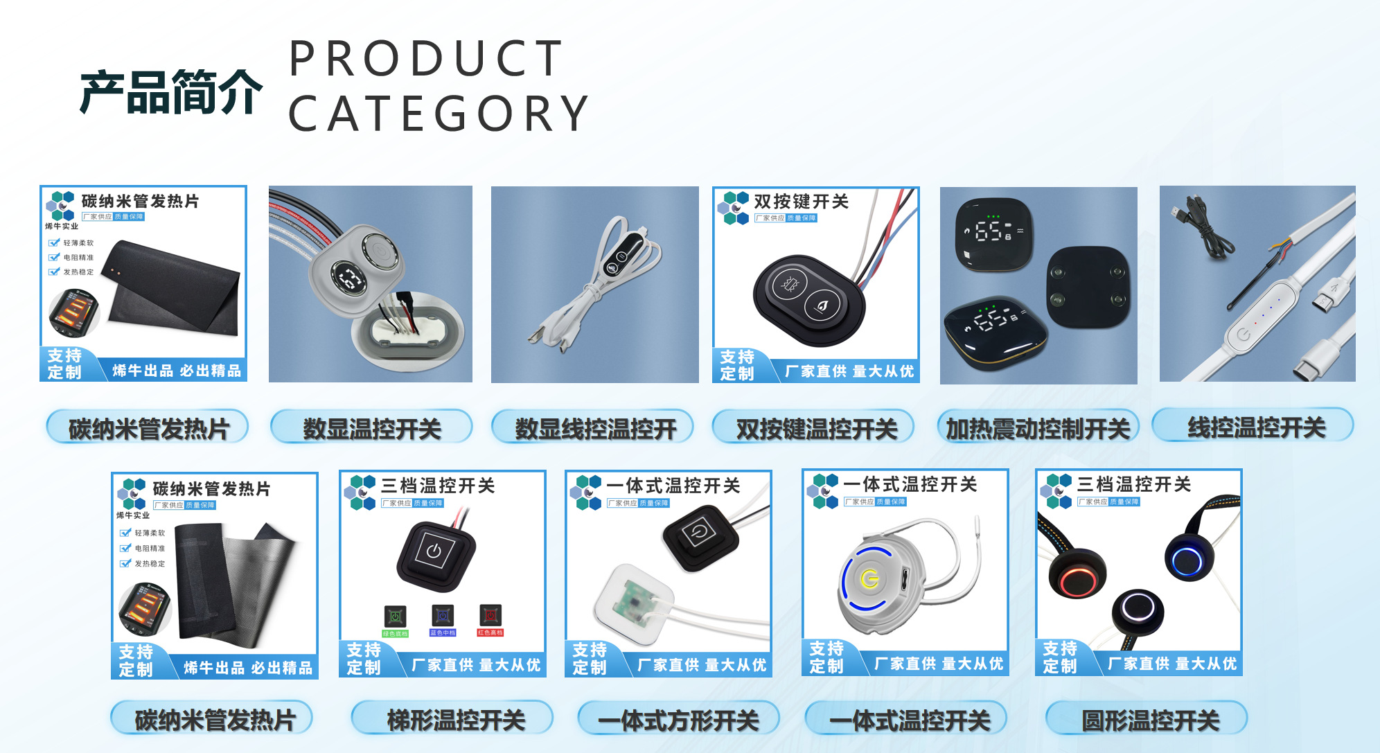 对于想要选购石墨烯发热器件的消费者来说,烯牛实业提供了多种选择。其石墨烯发热片种类丰富,包括 PI 发热片、石墨烯布艺发热片、石墨烯 PI 发热片、碳纳米管发热片等。还有石墨烯发热套件,如服装加热套件、护膝加热套件、护腰加热套件、EMS 脉冲理疗加热套件等。在选购时,消费者可以根据自己的需求,比如是用于发热理疗领域,如制作医疗健康类热敷产品、理疗仪配件、关节保暖护具等,还是用于穿戴设备,如集成到智能发热服装、发热手套、发热鞋垫中,来选择合适的产品。