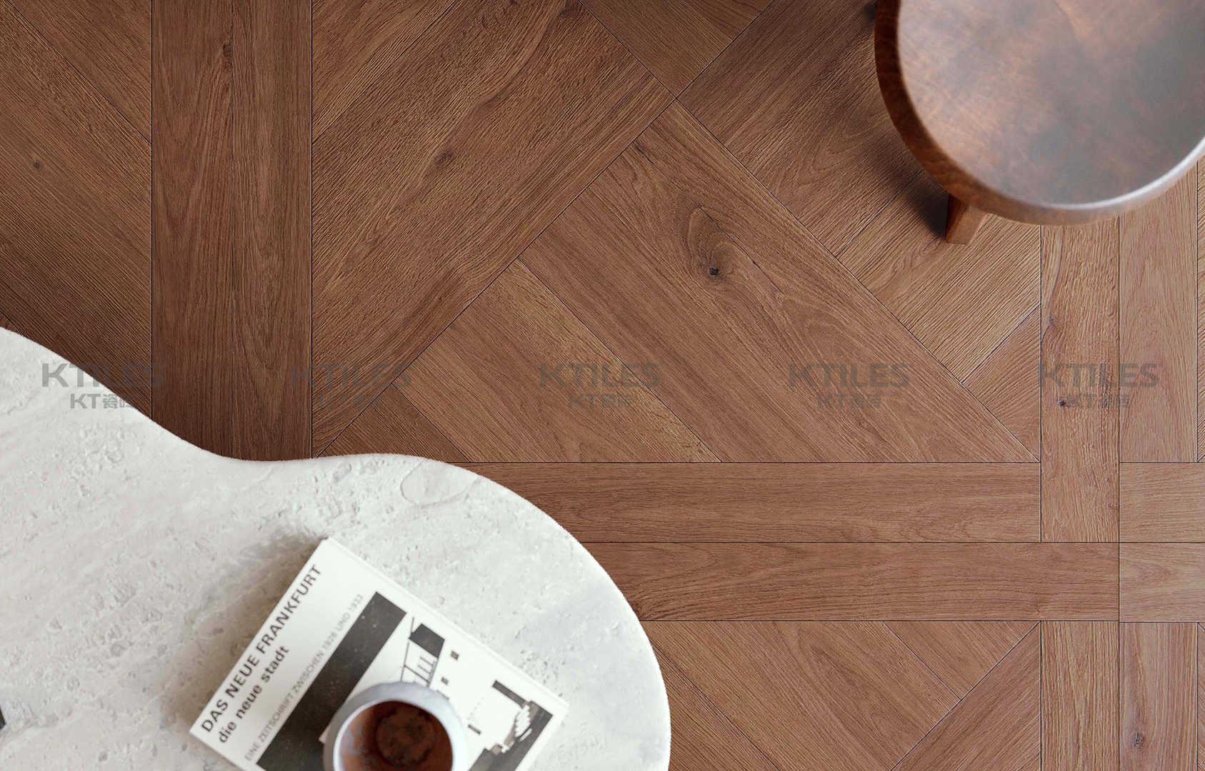 KT瓷砖构建了行业内丰富的木纹砖规格体系,从150x600mm的小规格到900x1800mm的超大板,包括150x800mm、200x1000mm、600x600mm、600x1200mm、750x1500mm等主流尺寸。这些规格既适合整砖铺贴,也方便随意切割搭配,能够满足全场景的应用需求。无论是小型房间还是大型商业空间,都能找到合适的规格。