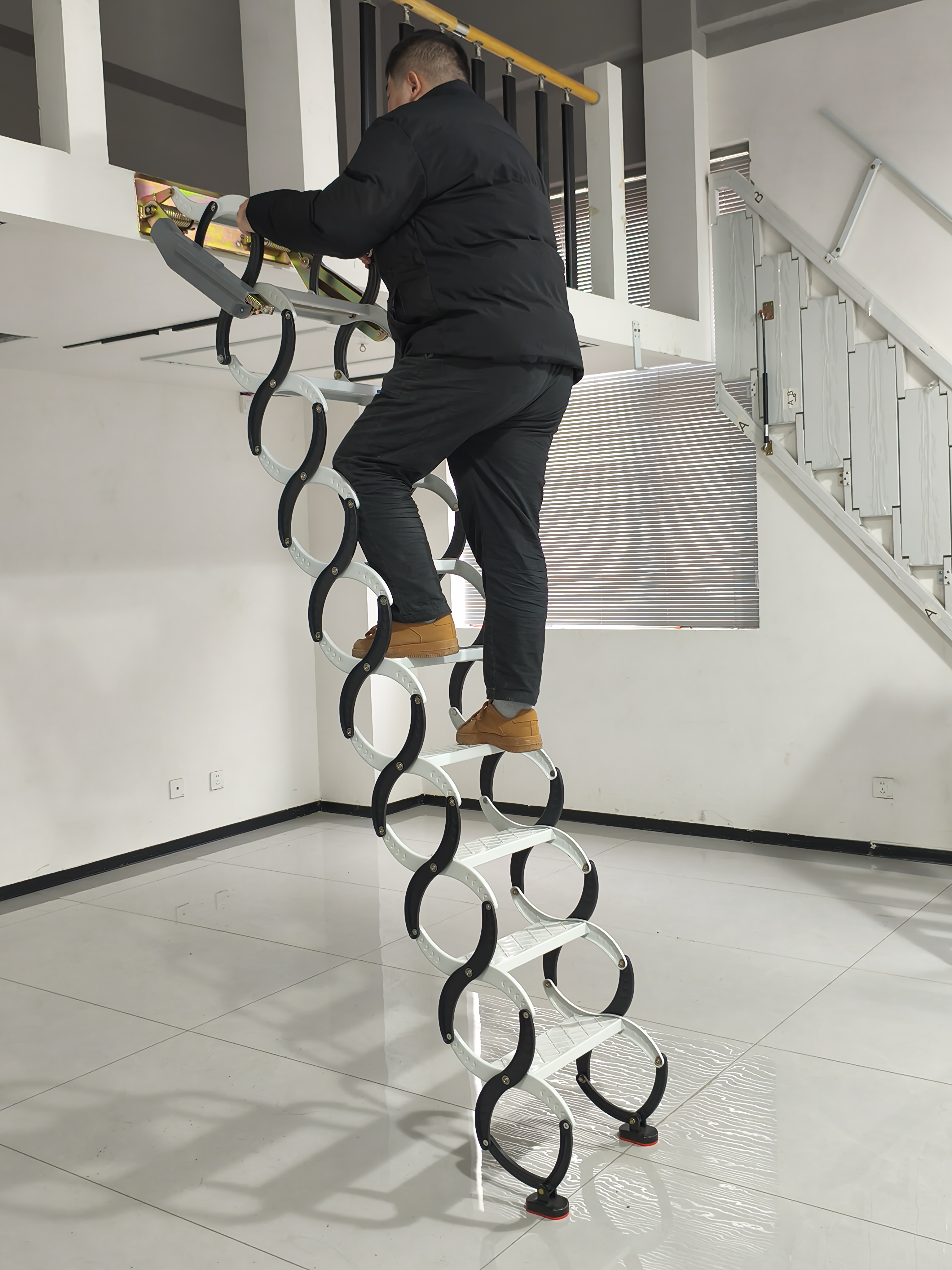 拥有20 + 项国家专利,产品的结构安全稳固。以合金钢材质的阁楼伸缩楼梯为例,采用S弯稳定支撑结构(非椭圆形状),关节处使用加固铆钉,经30万次拉伸测试不松动,结构稳固性显著提升。